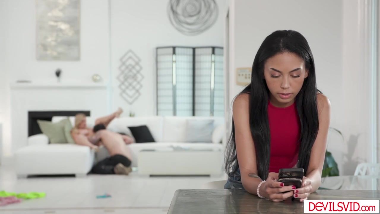 Stepdaughter Bianca Bangs caught her stepmom Danielle Renae letting the delivery guy lick her shaved pussy.The teen latina gets horny and starts masturbating while the big tits milf is deepthroating the dude before having him fuck her hard.